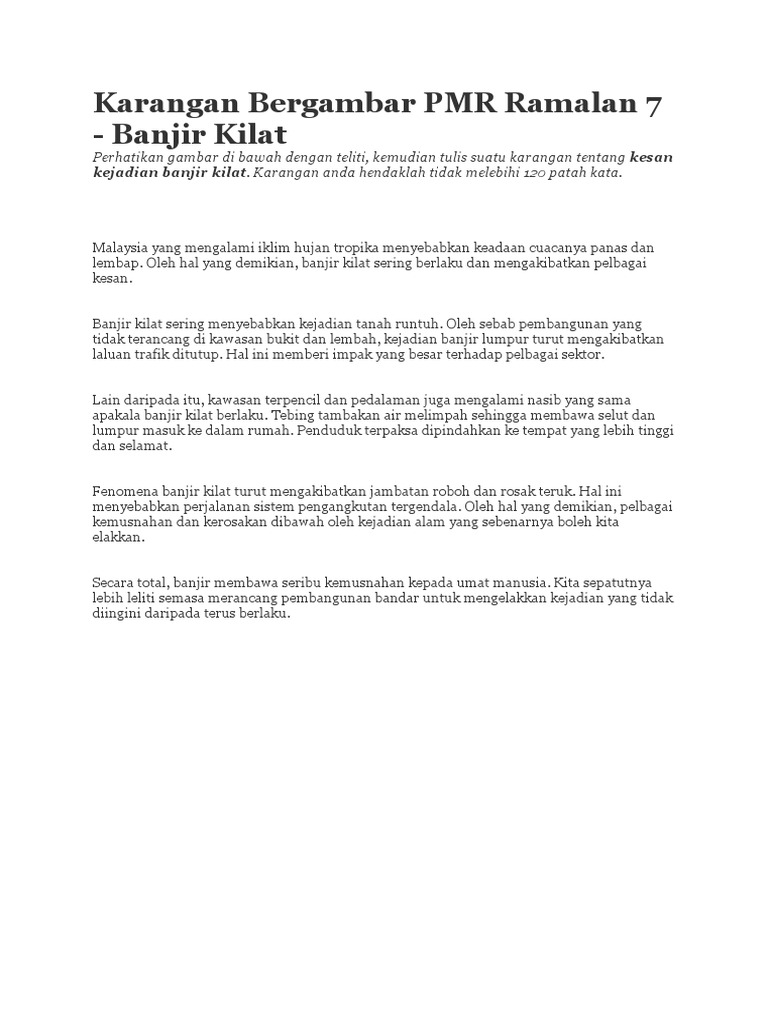 Tulis sebuah karangan tentang 'banjir'. Pada suatu hari di sebuah kerajaan besar lahirlah seorang putri cantik jelita bernama putri azalea. Banjir kilat kerap berlaku di negara kita. Sample essay dialogue on flood. Banjir yang disifatkan sebagai yang paling dahsyat dalam sejarah kampung kami akhirnya surut selepas seminggu.